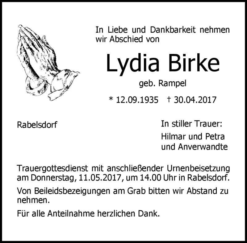 Hier finden Sie alle Traueranzeigen aus der Zeitung, die bisher für Lydia Birke erschienen sind. Weitere Traueranzeigen, die in der Zeitung erscheinen, werden hier ebenfalls aufgelistet