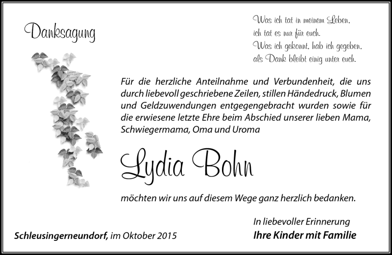 Hier finden Sie alle Traueranzeigen aus der Zeitung, die bisher für Lydia Bohn erschienen sind. Weitere Traueranzeigen, die in der Zeitung erscheinen, werden hier ebenfalls aufgelistet