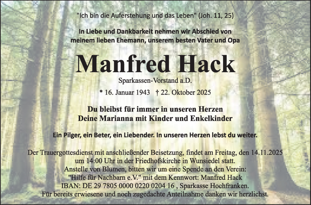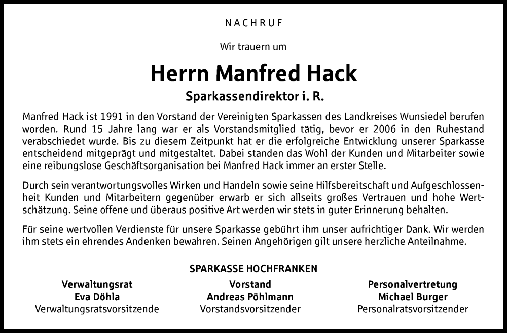 Hier finden Sie alle Traueranzeigen aus der Zeitung, die bisher für Manfred Hack erschienen sind. Weitere Traueranzeigen, die in der Zeitung erscheinen, werden hier ebenfalls aufgelistet