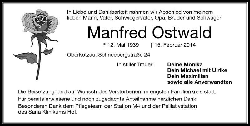 Hier finden Sie alle Traueranzeigen aus der Zeitung, die bisher für Manfred Ostwald erschienen sind. Weitere Traueranzeigen, die in der Zeitung erscheinen, werden hier ebenfalls aufgelistet