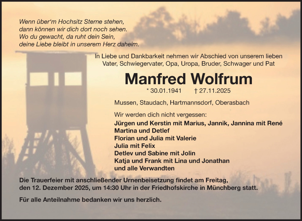 Hier finden Sie alle Traueranzeigen aus der Zeitung, die bisher für Manfred Wolfrum erschienen sind. Weitere Traueranzeigen, die in der Zeitung erscheinen, werden hier ebenfalls aufgelistet
