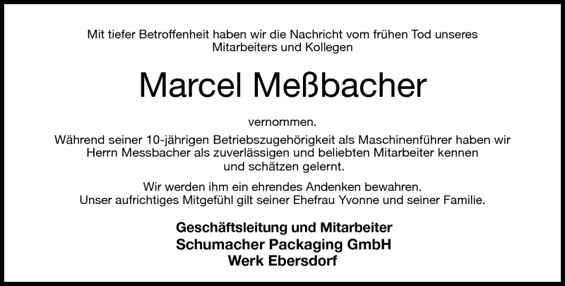 Hier finden Sie alle Traueranzeigen aus der Zeitung, die bisher für Marcel Messbacher erschienen sind. Weitere Traueranzeigen, die in der Zeitung erscheinen, werden hier ebenfalls aufgelistet