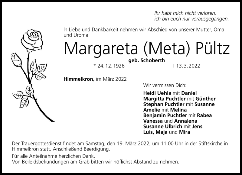 Hier finden Sie alle Traueranzeigen aus der Zeitung, die bisher für Margareta Pültz erschienen sind. Weitere Traueranzeigen, die in der Zeitung erscheinen, werden hier ebenfalls aufgelistet