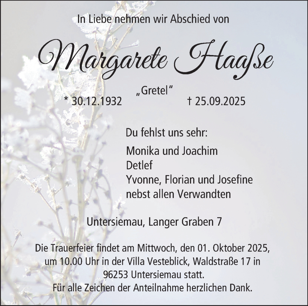 Hier finden Sie alle Traueranzeigen aus der Zeitung, die bisher für Margarete Haaße erschienen sind. Weitere Traueranzeigen, die in der Zeitung erscheinen, werden hier ebenfalls aufgelistet