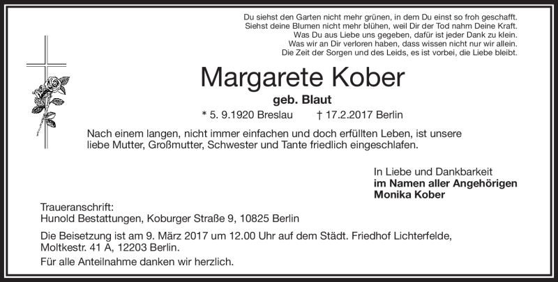 Hier finden Sie alle Traueranzeigen aus der Zeitung, die bisher für Margarete Kober erschienen sind. Weitere Traueranzeigen, die in der Zeitung erscheinen, werden hier ebenfalls aufgelistet