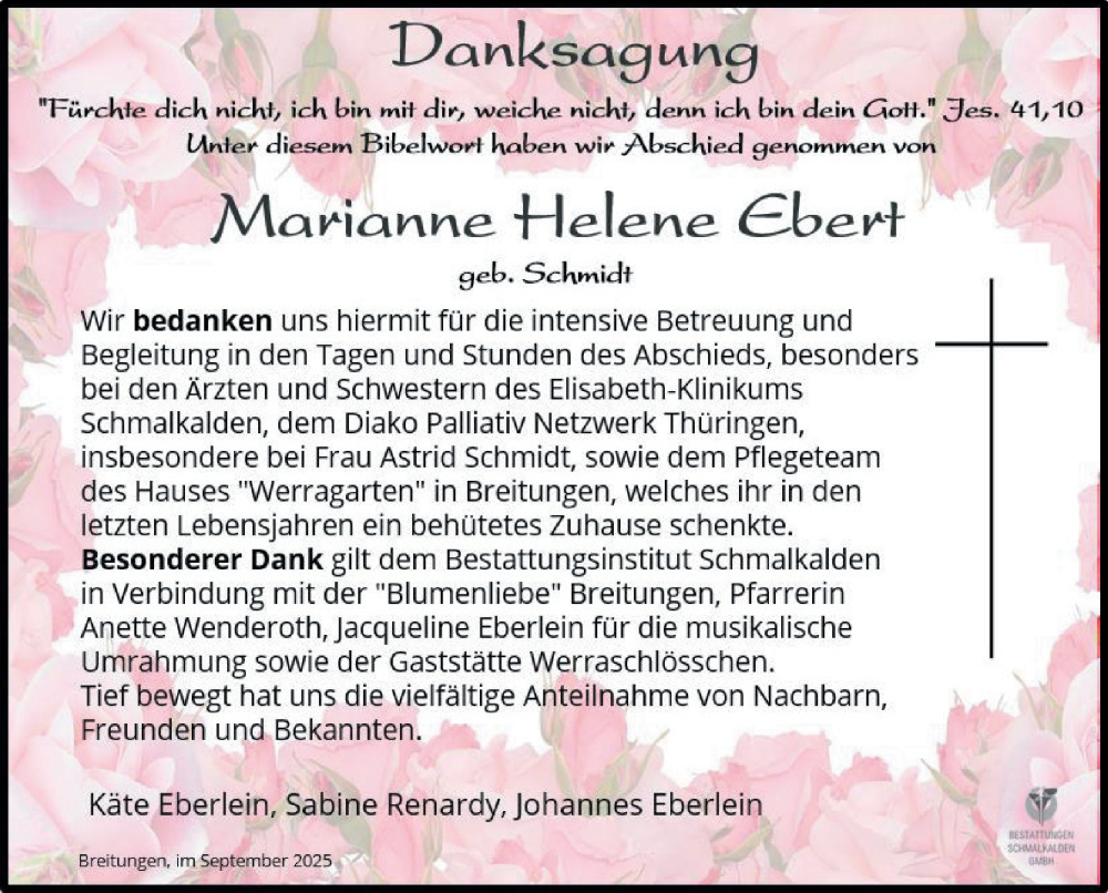 Hier finden Sie alle Traueranzeigen aus der Zeitung, die bisher für Marianne Helene Ebert erschienen sind. Weitere Traueranzeigen, die in der Zeitung erscheinen, werden hier ebenfalls aufgelistet