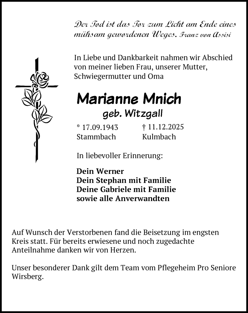Hier finden Sie alle Traueranzeigen aus der Zeitung, die bisher für Marianne Mnich erschienen sind. Weitere Traueranzeigen, die in der Zeitung erscheinen, werden hier ebenfalls aufgelistet