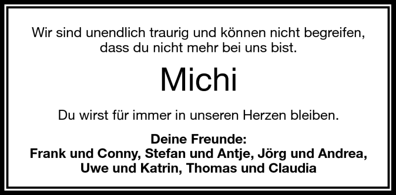 Hier finden Sie alle Traueranzeigen aus der Zeitung, die bisher für Michi erschienen sind. Weitere Traueranzeigen, die in der Zeitung erscheinen, werden hier ebenfalls aufgelistet