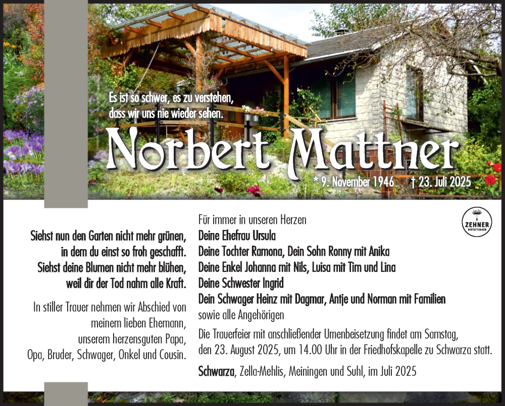 Hier finden Sie alle Traueranzeigen aus der Zeitung, die bisher für Norbert Mattner erschienen sind. Weitere Traueranzeigen, die in der Zeitung erscheinen, werden hier ebenfalls aufgelistet