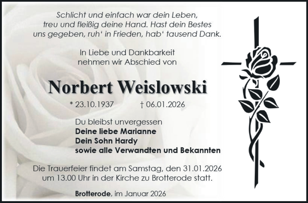 Hier finden Sie alle Traueranzeigen aus der Zeitung, die bisher für Norbert Weislowski erschienen sind. Weitere Traueranzeigen, die in der Zeitung erscheinen, werden hier ebenfalls aufgelistet