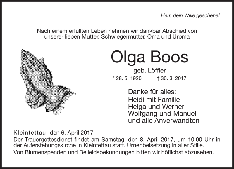 Hier finden Sie alle Traueranzeigen aus der Zeitung, die bisher für Olga Boos erschienen sind. Weitere Traueranzeigen, die in der Zeitung erscheinen, werden hier ebenfalls aufgelistet