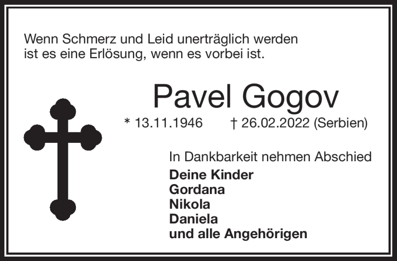 Hier finden Sie alle Traueranzeigen aus der Zeitung, die bisher für Pavel Gogov erschienen sind. Weitere Traueranzeigen, die in der Zeitung erscheinen, werden hier ebenfalls aufgelistet