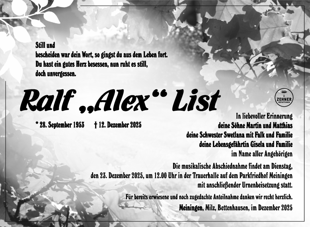 Hier finden Sie alle Traueranzeigen aus der Zeitung, die bisher für Ralf List erschienen sind. Weitere Traueranzeigen, die in der Zeitung erscheinen, werden hier ebenfalls aufgelistet