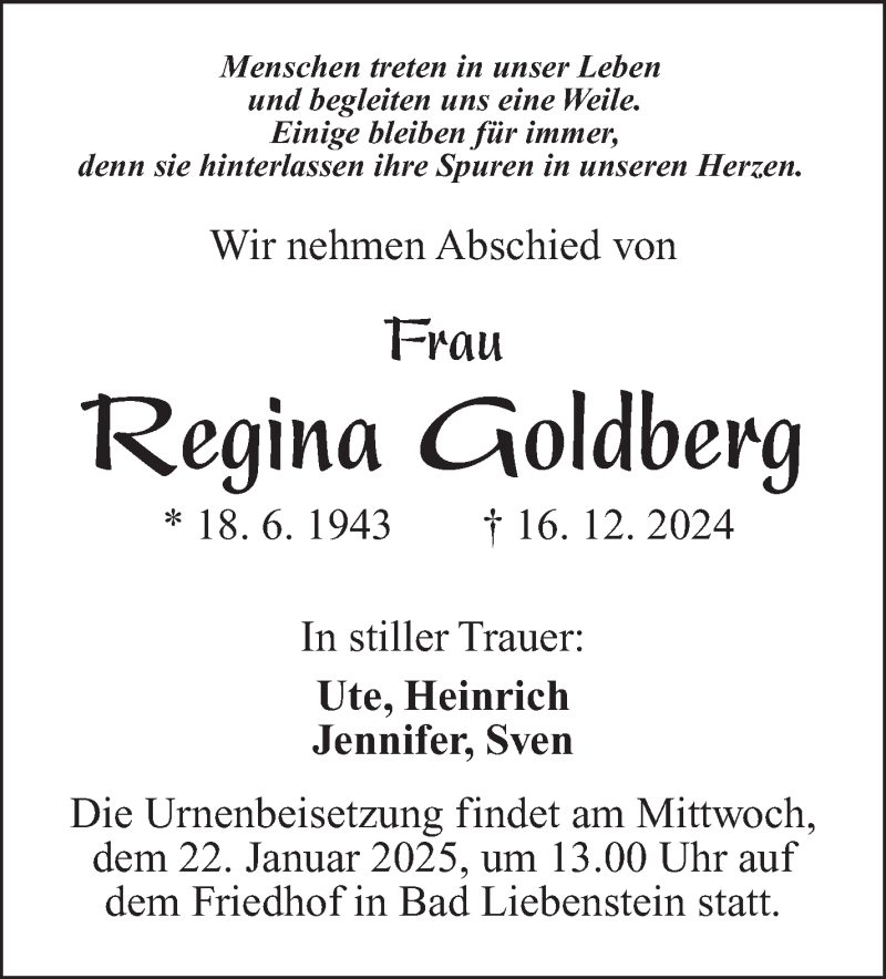 Hier finden Sie alle Traueranzeigen aus der Zeitung, die bisher für Regina Goldberg erschienen sind. Weitere Traueranzeigen, die in der Zeitung erscheinen, werden hier ebenfalls aufgelistet