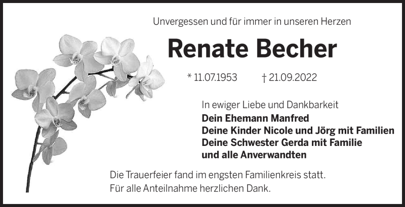 Hier finden Sie alle Traueranzeigen aus der Zeitung, die bisher für Renate Becher erschienen sind. Weitere Traueranzeigen, die in der Zeitung erscheinen, werden hier ebenfalls aufgelistet