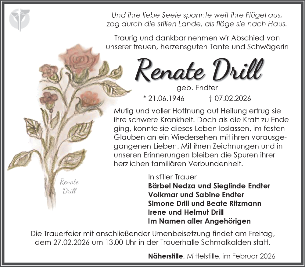 Hier finden Sie alle Traueranzeigen aus der Zeitung, die bisher für Renate Drill erschienen sind. Weitere Traueranzeigen, die in der Zeitung erscheinen, werden hier ebenfalls aufgelistet
