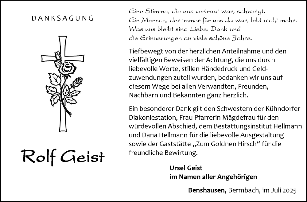 Hier finden Sie alle Traueranzeigen aus der Zeitung, die bisher für Rolf Geist erschienen sind. Weitere Traueranzeigen, die in der Zeitung erscheinen, werden hier ebenfalls aufgelistet