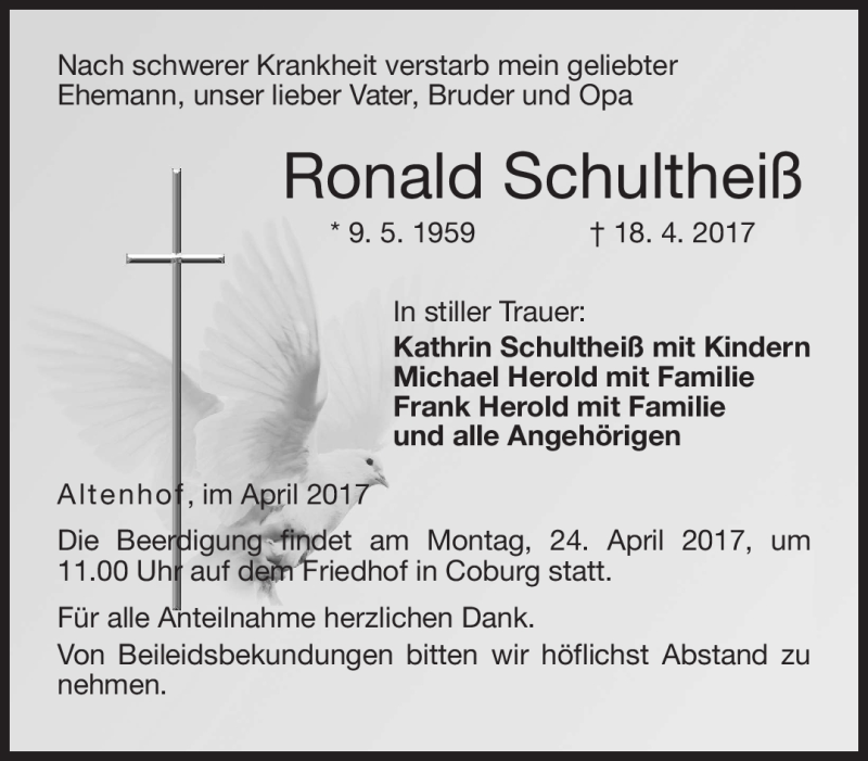 Hier finden Sie alle Traueranzeigen aus der Zeitung, die bisher für Ronald Schultheiß erschienen sind. Weitere Traueranzeigen, die in der Zeitung erscheinen, werden hier ebenfalls aufgelistet