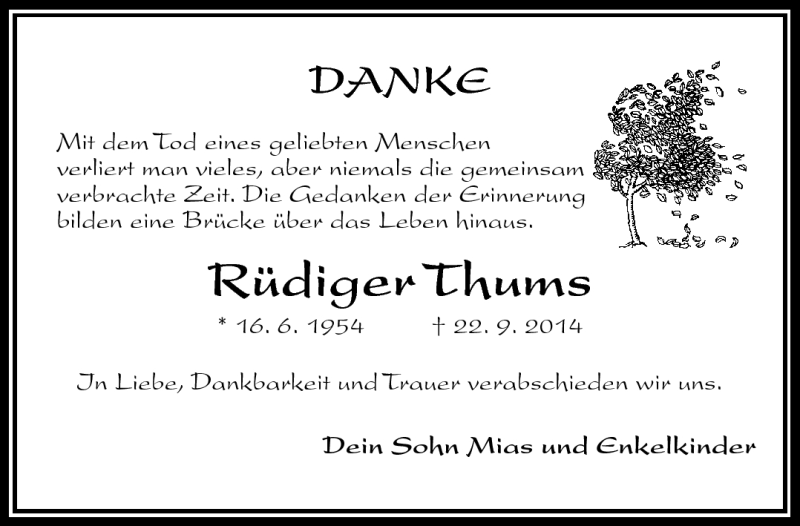 Hier finden Sie alle Traueranzeigen aus der Zeitung, die bisher für Rüdiger Thums erschienen sind. Weitere Traueranzeigen, die in der Zeitung erscheinen, werden hier ebenfalls aufgelistet