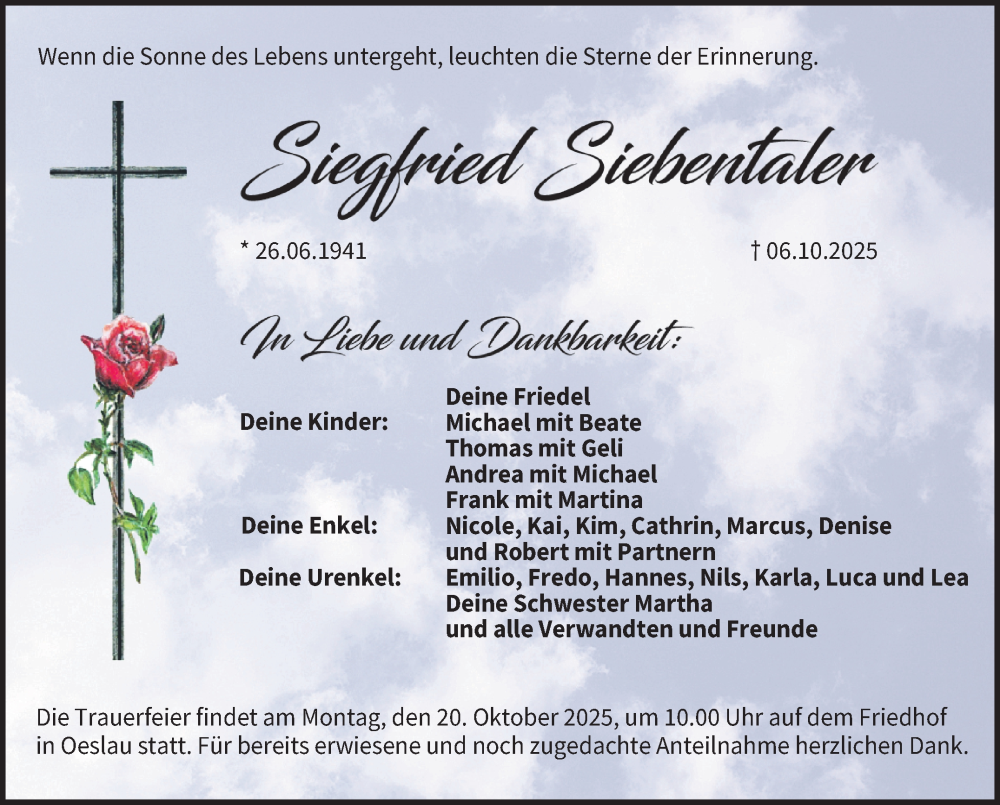 Hier finden Sie alle Traueranzeigen aus der Zeitung, die bisher für Siegfried Siebentaler erschienen sind. Weitere Traueranzeigen, die in der Zeitung erscheinen, werden hier ebenfalls aufgelistet