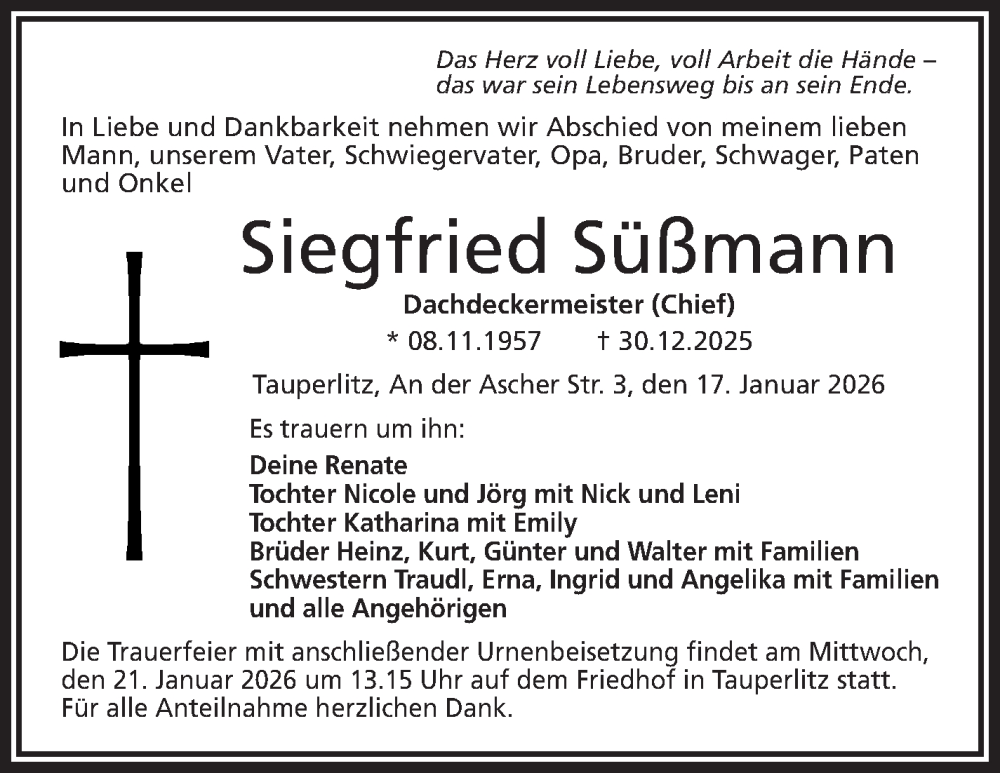 Hier finden Sie alle Traueranzeigen aus der Zeitung, die bisher für Siegfried Süßmann erschienen sind. Weitere Traueranzeigen, die in der Zeitung erscheinen, werden hier ebenfalls aufgelistet
