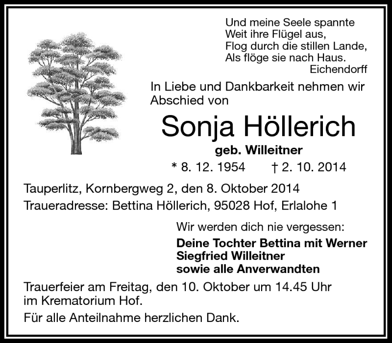 Hier finden Sie alle Traueranzeigen aus der Zeitung, die bisher für Sonja Höllerich erschienen sind. Weitere Traueranzeigen, die in der Zeitung erscheinen, werden hier ebenfalls aufgelistet