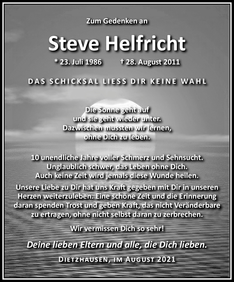 Hier finden Sie alle Traueranzeigen aus der Zeitung, die bisher für Steve Helfricht erschienen sind. Weitere Traueranzeigen, die in der Zeitung erscheinen, werden hier ebenfalls aufgelistet