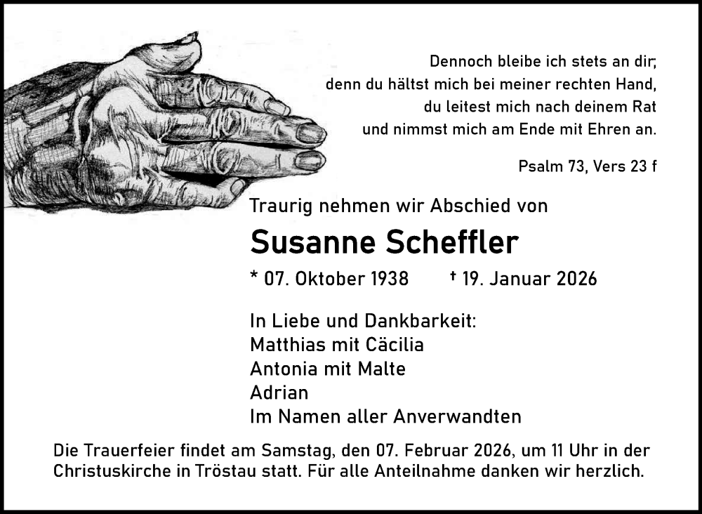 Hier finden Sie alle Traueranzeigen aus der Zeitung, die bisher für Susanne Scheffler erschienen sind. Weitere Traueranzeigen, die in der Zeitung erscheinen, werden hier ebenfalls aufgelistet