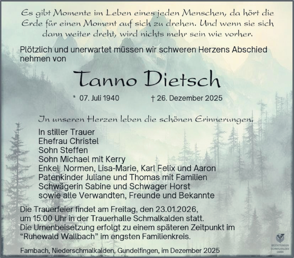 Hier finden Sie alle Traueranzeigen aus der Zeitung, die bisher für Tanno Dietsch erschienen sind. Weitere Traueranzeigen, die in der Zeitung erscheinen, werden hier ebenfalls aufgelistet