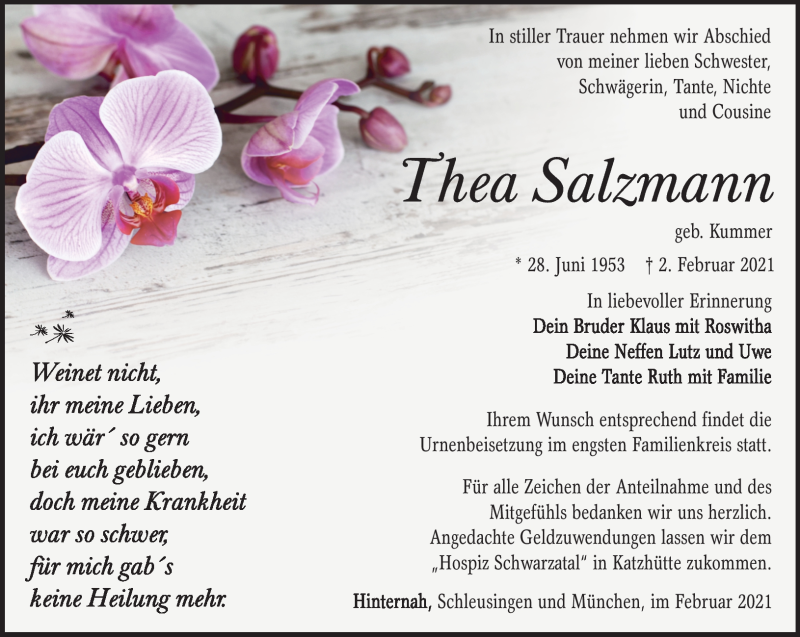 Hier finden Sie alle Traueranzeigen aus der Zeitung, die bisher für Thea Salzmann erschienen sind. Weitere Traueranzeigen, die in der Zeitung erscheinen, werden hier ebenfalls aufgelistet