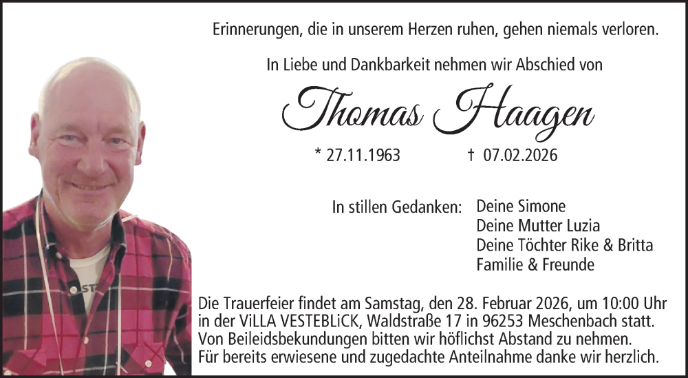 Hier finden Sie alle Traueranzeigen aus der Zeitung, die bisher für Thomas Haagen erschienen sind. Weitere Traueranzeigen, die in der Zeitung erscheinen, werden hier ebenfalls aufgelistet