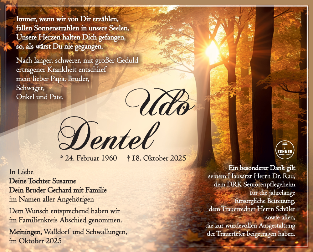 Hier finden Sie alle Traueranzeigen aus der Zeitung, die bisher für Udo Dentel erschienen sind. Weitere Traueranzeigen, die in der Zeitung erscheinen, werden hier ebenfalls aufgelistet