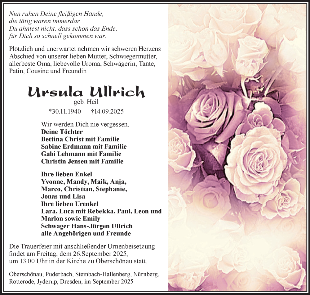 Hier finden Sie alle Traueranzeigen aus der Zeitung, die bisher für Ursula Ullrich erschienen sind. Weitere Traueranzeigen, die in der Zeitung erscheinen, werden hier ebenfalls aufgelistet