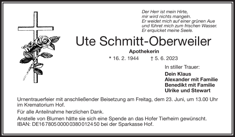 Hier finden Sie alle Traueranzeigen aus der Zeitung, die bisher für Ute Schmitt-Oberweiler erschienen sind. Weitere Traueranzeigen, die in der Zeitung erscheinen, werden hier ebenfalls aufgelistet