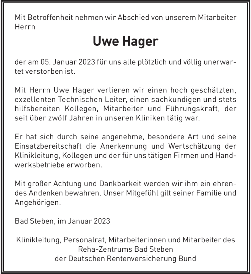 Hier finden Sie alle Traueranzeigen aus der Zeitung, die bisher für Uwe Hager erschienen sind. Weitere Traueranzeigen, die in der Zeitung erscheinen, werden hier ebenfalls aufgelistet