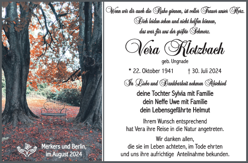 Hier finden Sie alle Traueranzeigen aus der Zeitung, die bisher für Vera Klotzbach erschienen sind. Weitere Traueranzeigen, die in der Zeitung erscheinen, werden hier ebenfalls aufgelistet