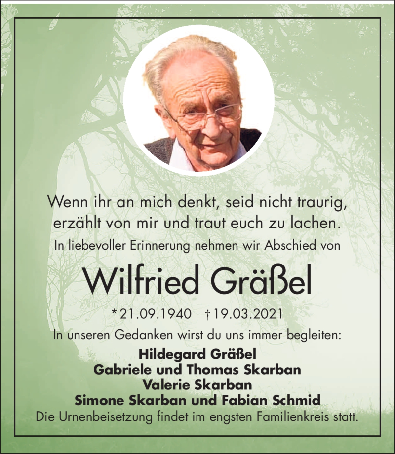 Hier finden Sie alle Traueranzeigen aus der Zeitung, die bisher für Wilfried Gräßel erschienen sind. Weitere Traueranzeigen, die in der Zeitung erscheinen, werden hier ebenfalls aufgelistet