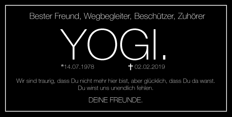 Hier finden Sie alle Traueranzeigen aus der Zeitung, die bisher für Yogi erschienen sind. Weitere Traueranzeigen, die in der Zeitung erscheinen, werden hier ebenfalls aufgelistet